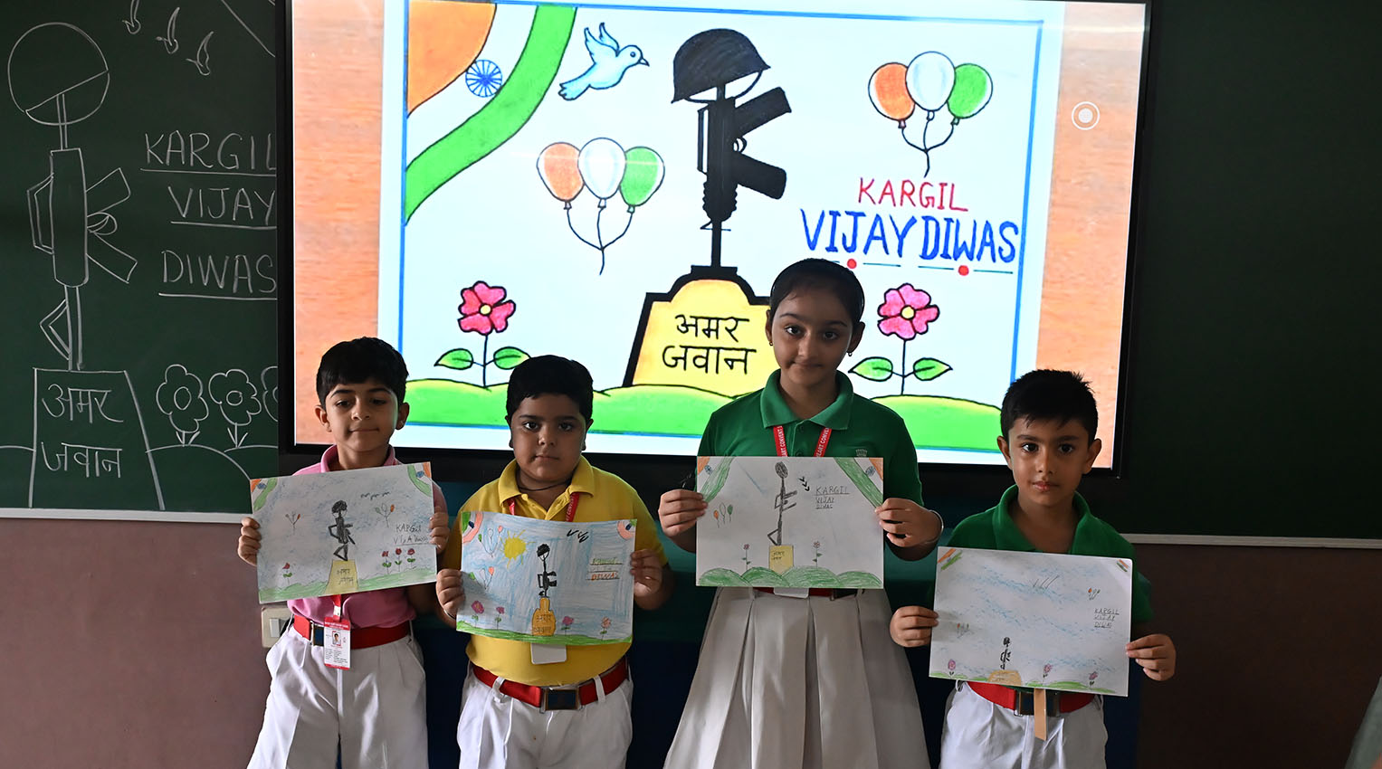 Description: To honor the indomitable courage and supreme sacrifice of our Indian soldiers, an Art Activity was organised on the occasion of Kargil Vijay Diwas on 26th July, 25. The activity aimed to instill a deep sense of patriotism, respect, and gratitude among students for the brave heroes who laid down their lives in the Kargil War safeguard the sovereignty of our nation. Students of Class I and II participated enthusiastically, using colors, creativity, and emotion to express their heartfelt tributes. Sketches were filled with images of soldiers, the Indian flag and mountains of Kargil. The Art Activity was a heartfelt tribute and a reminder that freedom is earned, and it must be cherished.