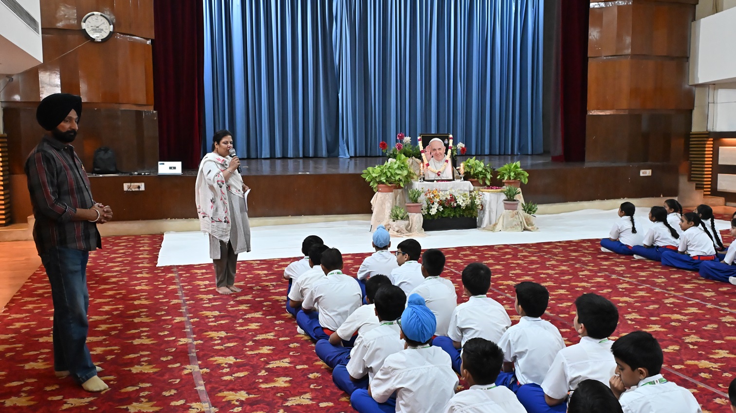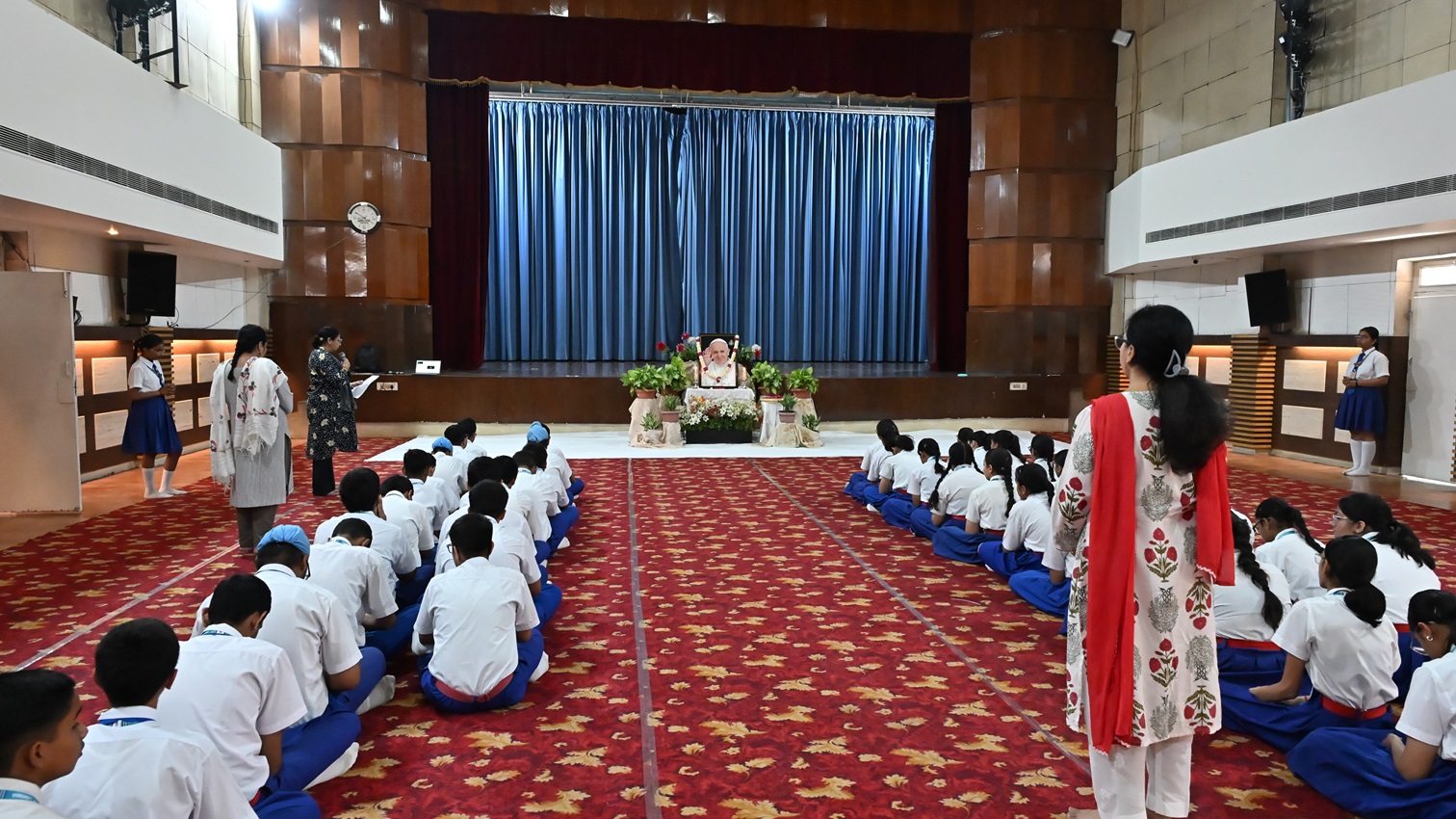 Description: WITH HEARTS FULL OF REVERENCE AND GRATITUDE, THE STUDENTS AND TEACHERS CAME TOGETHER TO OFFER SPECIAL PRAYERS AND A FLORAL TRIBUTE TO HIS HOLINESS POPE FRANCIS. IN A SOLEMN GATHERING, WE PRAYED FOR HIS CONTINUED GUIDANCE FOR THE WORLD. THE FLORAL OFFERINGS SYMBOLIZED LOVE, RESPECT, AND HEARTFELT WISHES FOR HIS MISSION OF PEACE, COMPASSION, AND UNITY. THROUGH THIS HUMBLE ACT, WE REAFFIRMED OUR COMMITMENT TO THE VALUES OF KINDNESS, SERVICE, AND FAITH THAT POPE FRANCIS INSPIRES IN ALL OF US. MAY GOD CONTINUE TO BLESS AND PROTECT OUR HOLY FATHER.